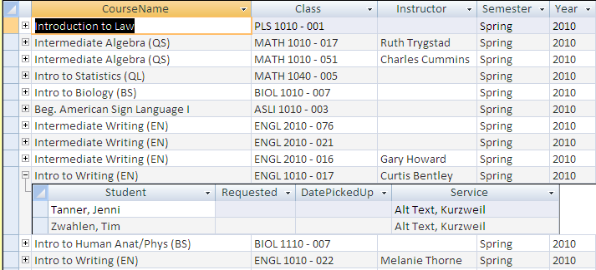 Current semester classes are shown in the Class Accommodations section (pulled in from Banner) and