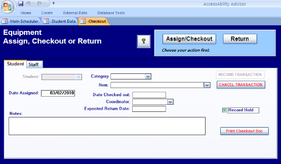inventory items to students. It can also be used to check these items out to staff members. A different