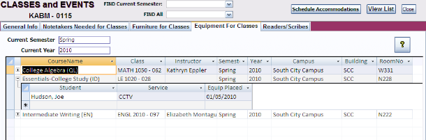 classroom). Current semester classes are shown in the Class Accommodations section (pulled in