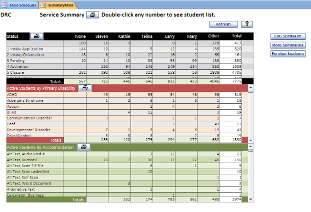 Summary Counts and Lists: System summaries are continually updated service counts. They are organized into several categories of like data. . Row and column totals are provided. These summaries provide an instant overview of service counts and can be used for reporting purposes. All summary reports are grouped by advisors: None are students who do not have an assigned advisor (unassigned students or possibly errors which should be checked), others are other staff not listed by name (this is unlikely in a live data base - [but can exist in our test situation]).