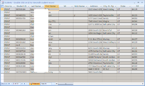 Clicking on a number in any row/column will bring up a list of students- for that item and that advisor. Clicking on any name will bring up the Student Data tabs. Clicking the printer icon will print the list.