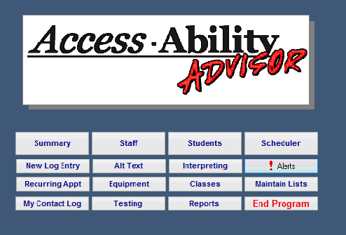 For more sales and training information, please call Sheila Arnett at 612-756-8596 or email at sheila.arnett@yahoo.com. Click on the hyperlinks below for more information regarding Advisor's features and screen shots of the program. The Scheduler: The appointment scheduler tracks staff and student appointments, organizes the information in such a way that statistical summaries can be generated. Scheduling data can be displayed in several ways. Status Summary: (NEW FEATURE) These on-screen Summary lists display current student activity levels. Lists and counts of active students, students broken down by disability, or student lists/counts by college major are examples. The are continually updated by entries made into the system and provide instant on-screen reports. Student Data: The student database contains application information, demographics, disabilities, limitations and documentation history. Various forms and reports can be produced. Contact Data: A database of contacts to include staff, service providers, community counselors and clinicians as well as emergency and family contacts is maintained Personal, educational and employment data can be collected, Hourly services by type and payment information can be entered for a complete payroll system. Classes and Accommodations: Search and match functions can be used to match students, to classes and available service providers. A special screen has been designed specifically for interpreter matching. (ENHANCED FEATURE) The college catalog/course information can be linked to the student database through a Banner interface. Equipment and Alternative Text (ENHANCED FEATURE) Books: The inventory system can be used to track adaptive equipment, assistive technology and alternative texts (CD, tape, enlarged print etc). A complete checkout system is included. Reports: A series of pre-defined reports can be generated as needed. Data can be queried using a variety of options such as date ranges, staff, demographic, disability, major, accommodations. Banner data can also be queried and ad hoc reports can be created using Access reporting functions. |
